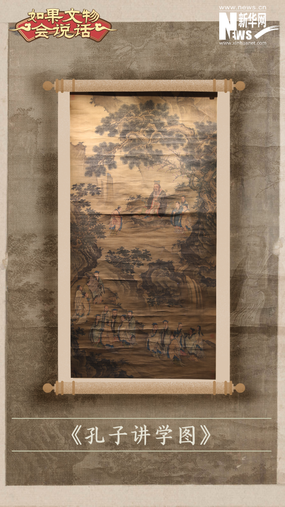 这幅画总纵298.5厘米,横106.5厘米;画心纵166.5厘米,横85厘米。孔子手持如意,怀揽凭几,端坐在松杏之下的平石上。其前一弟子躬身请教,其左则有侍立弟子三人。另有弟子沿山道而上,分成三组,彼此顾盼,交谈自若。这一画面的精心安排,给观者留下一个极大的想象空间,使人们自然地想到:那延伸到画外的山道上,定还会有众多弟子……作者以图解式的语言,鲜明地道出孔子“弟子弥众”这一现象。画中高山、块石、瀑布、流水以及劲松、丛树串联起不同的场景,营造出清旷闲淡的讲学气氛。孔子作为儒家的开山鼻祖,在我国古代有着举足轻重的地位,他的办学方式、讲学内容、教学方法等都是中国教育史上的创举。在教育对象方面,孔子以“性相近也,习相远也”为理论基础,提出“因材施教,有教无类”等思想对后世影响深远。