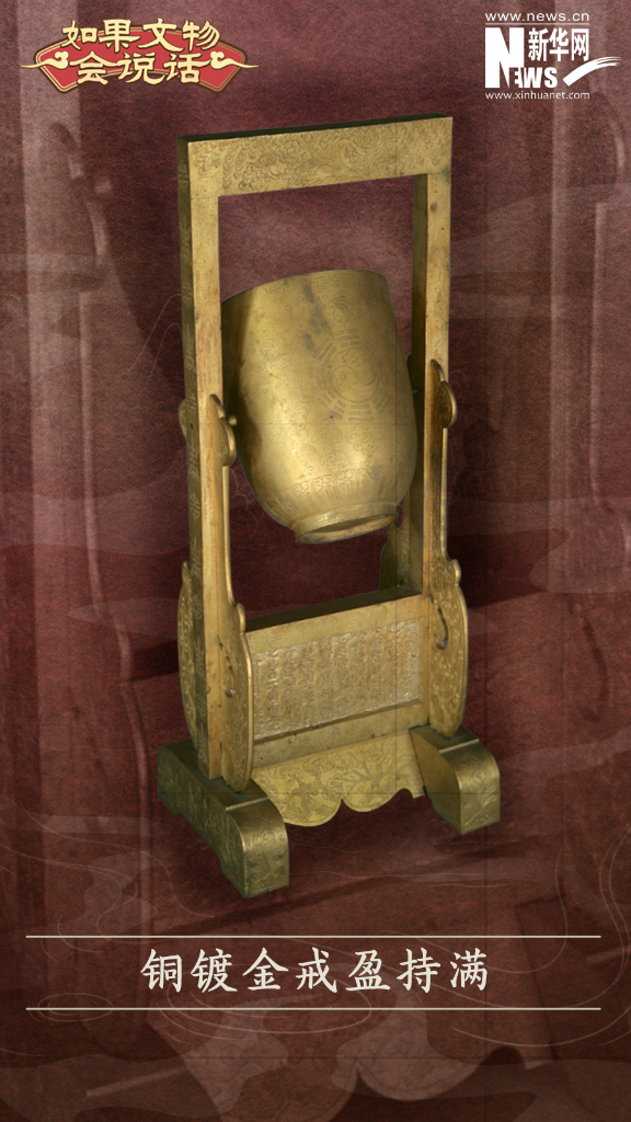 铜镀金戒盈持满,清光绪,器高15厘米,直径11.7厘米,架子高45.7厘米,宽18.5厘米。清宫造办处制作。清宫旧藏。此器铜质镀金,其正面横梁錾刻“光绪御制”四字篆书,框架中间的杯状容器可在支架上自由转动——如往杯中注水,水至一半时,容器垂直而立,水注满时,则容器翻倒,水泼洒出。因其易倾覆,又名曰“欹器”。框架下部有一横梁,其下镶嵌条环板,板两面均有阳刻铭文,内容记载孔子观周朝欹器时与守庙者的对话。孔子通过欹器的“虚则欹,中则正,满则覆”,教育弟子为人处世“满招损,谦受益,戒盈持满”。欹器所蕴含的戒满与持中的道理影响后世深远。