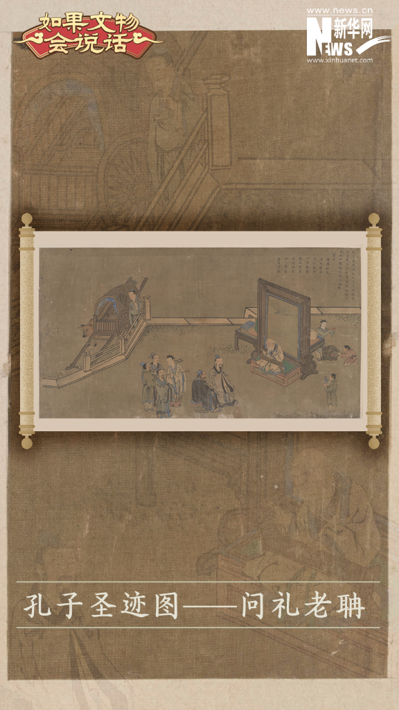 这幅画总纵41.5厘米,横66.2厘米;画心纵33厘米,横61厘米。在虚心求学方面,孔子同样给学生们带了好头。此画描绘孔子“问礼老聃”的情景。孔子曾游历周都洛邑并向老子问学。画中孔子端坐于老子面前,专心聆听老子宣讲。这幅画表现孔子对前辈学者的尊敬和对知识的追求。《孔子圣迹图》是一系列描绘孔子生平和事迹的画作,其中不乏展现孔子作为老师的形象,以及他与弟子之间的互动,从而体现出尊师重道的精神。