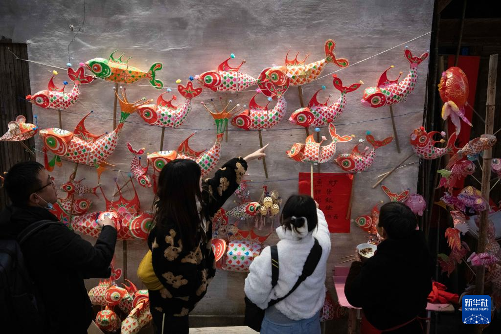 1月18日,在安徽省黄山市歙县北岸镇瞻淇村,游客在选购鱼灯。