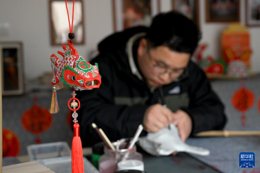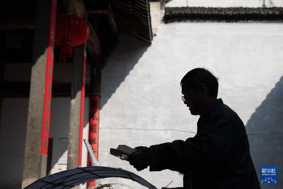 1月6日,在安徽省黄山市歙县北岸镇瞻淇村,瞻淇鱼灯非遗传承人汪宇昉在制作鱼灯。