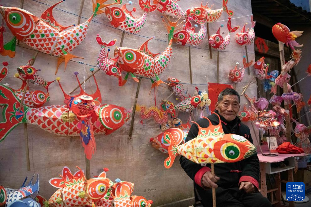 1月6日,在安徽省黄山市歙县北岸镇瞻淇村,瞻淇鱼灯非遗传承人汪观海在家中展示自己制作的鱼灯。