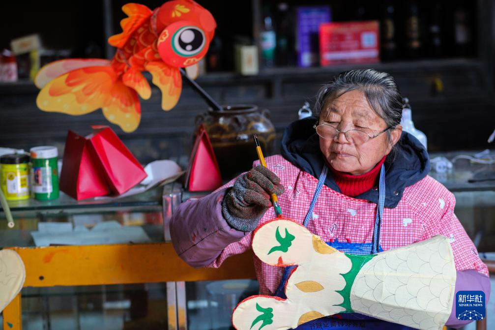 1月18日,在安徽省黄山市歙县北岸镇瞻淇村,村民汪文英在制作鱼灯。
