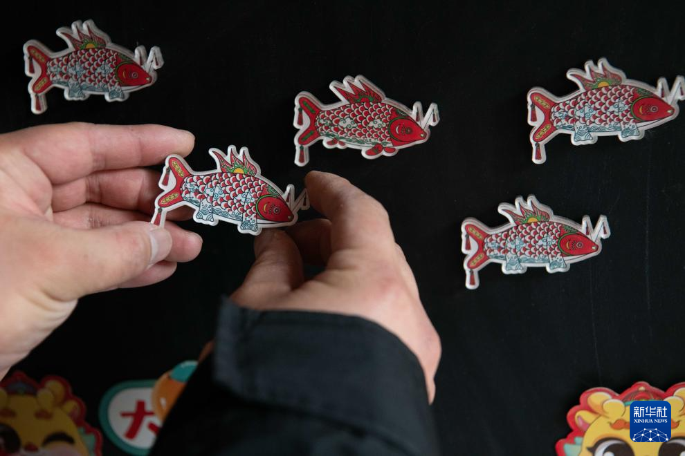 1月6日,在安徽省黄山市歙县北岸镇瞻淇村,瞻淇鱼灯非遗传承人汪宇昉展示自己设计的鱼灯文创产品。