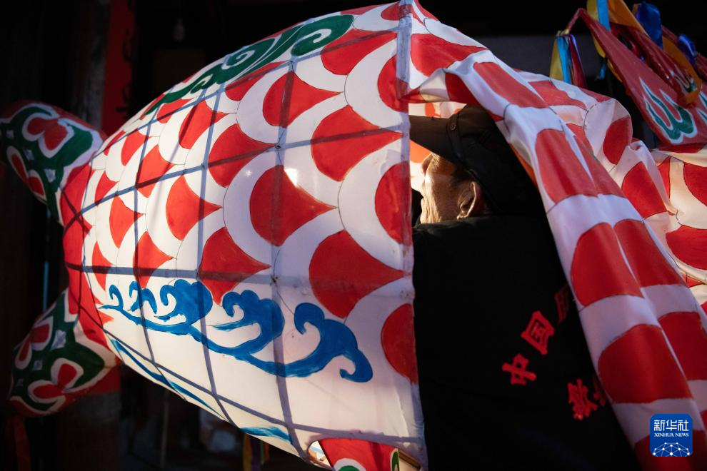 1月8日,在安徽省黄山市歙县北岸镇瞻淇村一处祠堂里,村民点亮鱼灯,准备在村里舞灯。