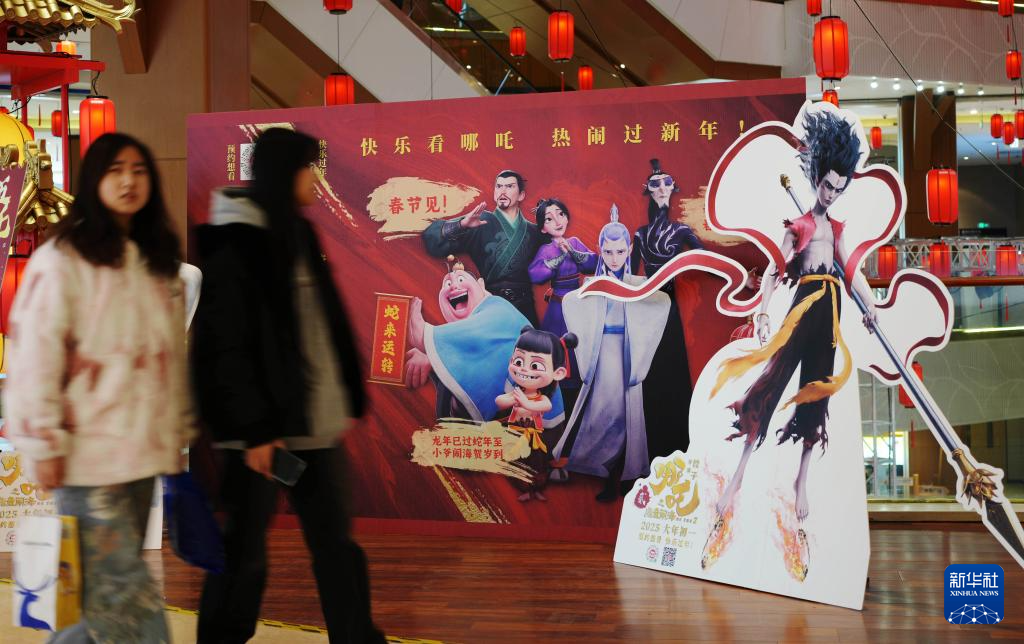 2月18日,在沈阳一家商场,顾客从电影《哪吒之魔童闹海》的宣传广告牌前经过。新华社记者 李钢 摄