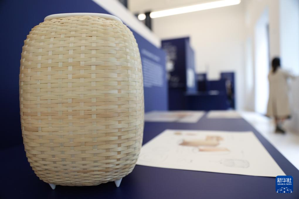 这是4月13日在意大利米兰设计周贵州工业设计城展区拍摄的竹编工艺展品。