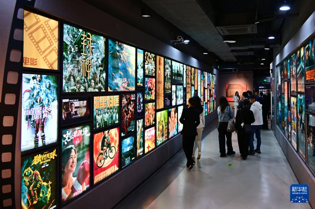 4月28日,观众从青岛电影博物馆电影海报长廊经过。