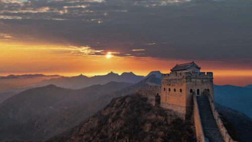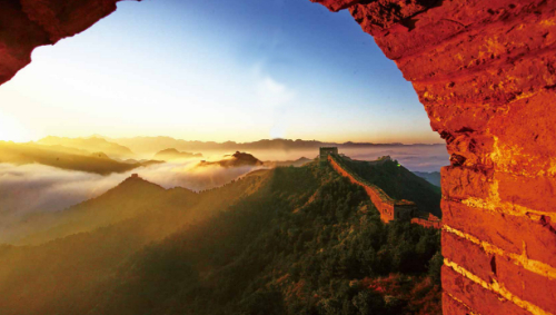 跨峻岭,穿荒原,横瀚海,经绝壁,纵横十万里。望不断长龙烽垛,雄关隘口,犹如玉带明珠,点缀成江山锦绣。起伏奔腾,飞舞盘旋,长城就是中国人给这个世界增添的伟大奇迹。