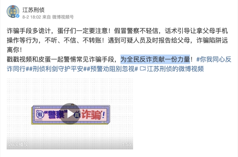 扎实的科普内容,新颖的形式设计,本次合作得到了社会各界的广泛关注,权威机构也纷纷为此点赞,吸引公安部刑侦局、江苏刑侦等加入参与相关内容的传播,共同传递全民反诈普法的力量。