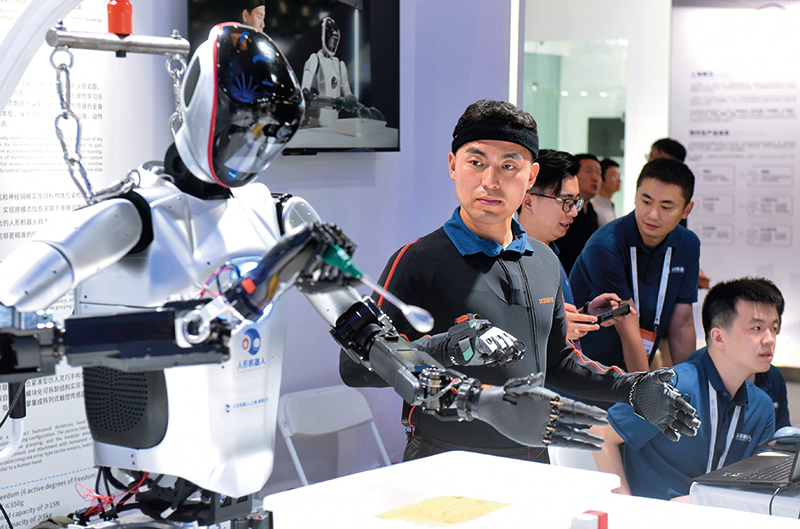 工作人员在2024世界人工智能大会上展示手势控制机器人操作流程(2024年7月4日摄) 黄晓勇摄/本刊