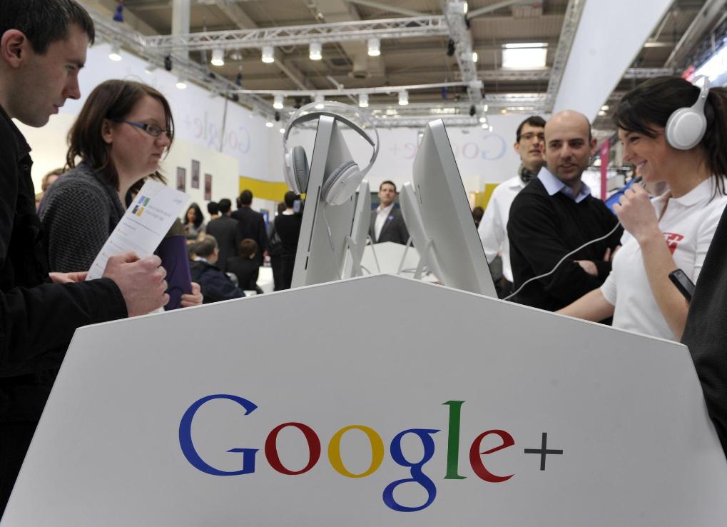 这张资料照片显示,2012年3月6日,在德国汉诺威会展中心举行的汉诺威信息及通信技术博览会上,参观者在谷歌展台参观。新华社记者马宁摄