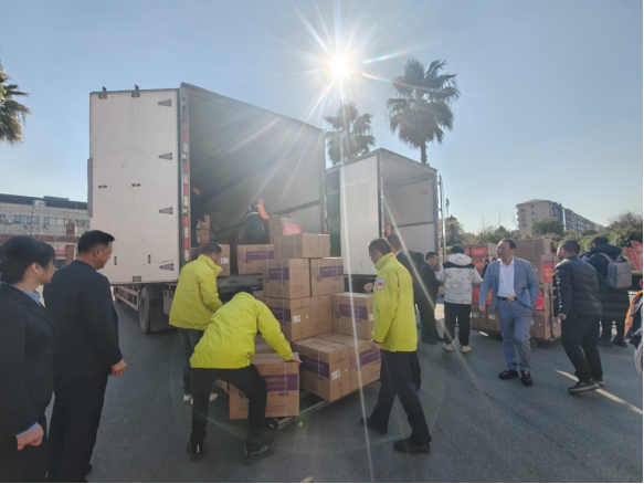 1月10日,在洪达集团的捐赠现场,整齐摆放的救灾医疗物资正陆续装车,准备发往西藏灾区。