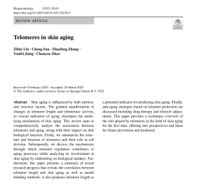 首先,研究员们通过总结大量研究方法和实验技术,分析端粒——一种特殊的DNA-蛋白质复合物——可作为皮肤衰老过程的重要预测指标。还总结了从端粒侧治疗皮肤衰老的策略,包括端粒酶激活剂,抗氧化剂和营养补充剂的应用,以及生活方式(如饮食、运动和睡眠等)调整等对端粒长度的影响。该研究成果被收录在《Biogerontology》(生物老年学)期刊中,为未来预防和治疗皮肤衰老提供了新的思路和方法。