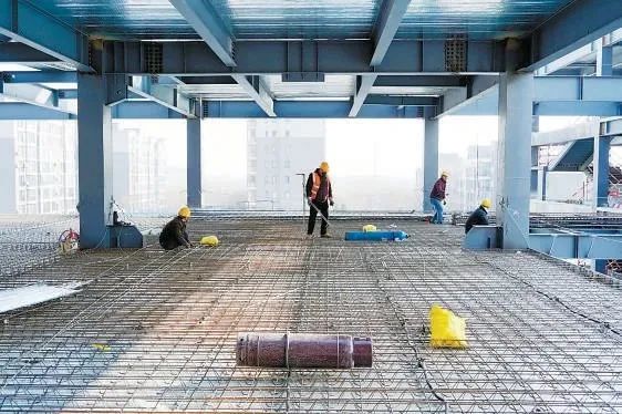 在北大附中石景山学校(新址)项目施工现场,工人进行钢筋绑扎、楼层板铺设作业。