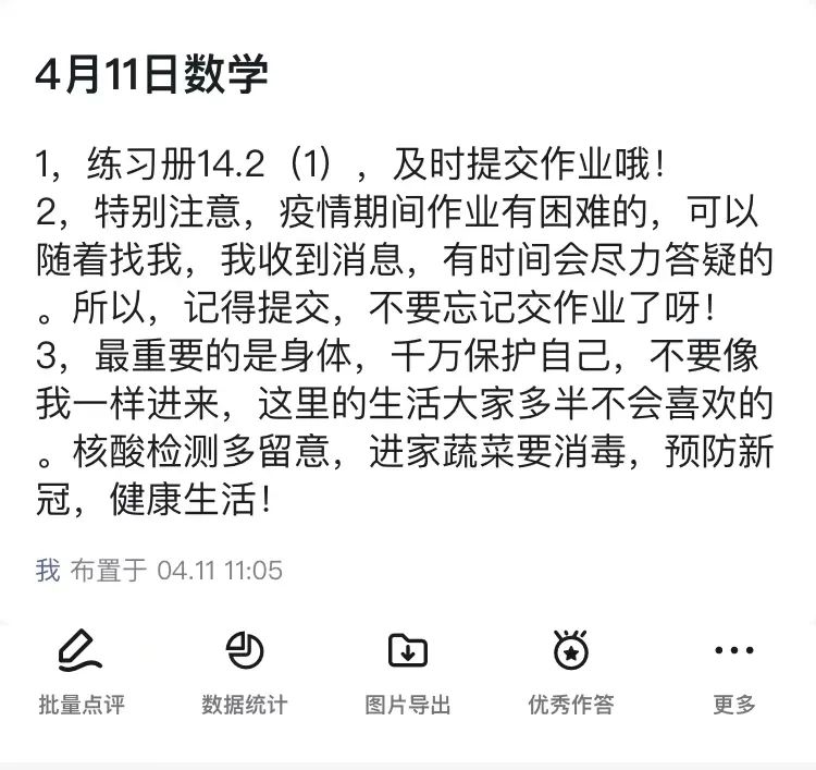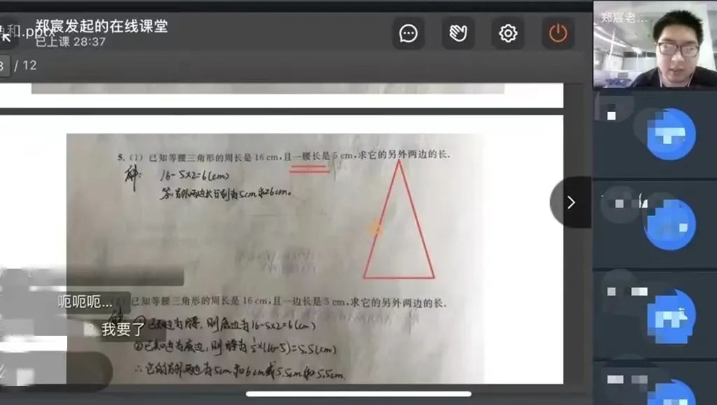 4月11日上午,在隔离点的第一堂数学课,非常顺利!郑宸戴着耳机讲课,学生们表示收音效果也不错。虽然,隔离点条件有限,但郑宸尽力克服,这一节数学课上的是七年级第二学期第十四章《14.2三角形的内角和》,网课评论区异常安静,孩子们听得格外专注。