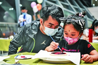 成都博物馆,家长带小朋友在夜间体验成都漆器制作。新华社发