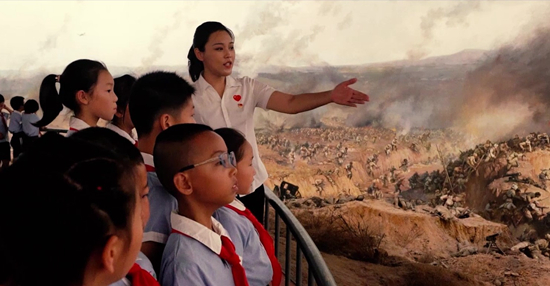 辽沈战役纪念馆讲解员姚璐璐在全景画馆为小学生讲述战斗故事。