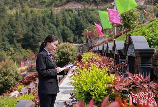 4月3日,重庆市石柱土家族自治县,万福山生态陵园,陵园00后工作人员谭春燕在墓地检查一处墓位的维护情况。中青报·中青网记者 曲俊燕/摄