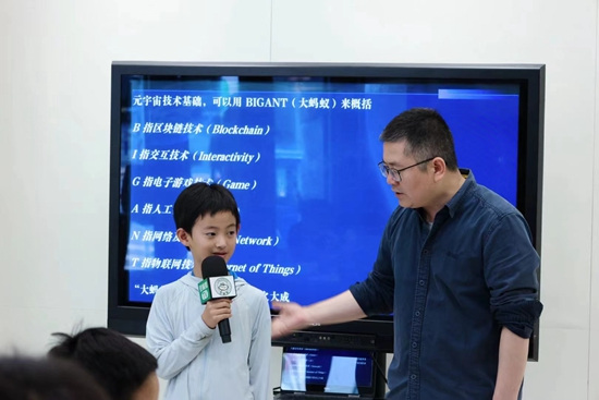 今年5月,一名小学生在元宇宙职业体验课现场与研学旅行指导师互动问答。该研学旅行项目共8期,参与学生160人。受访者供图