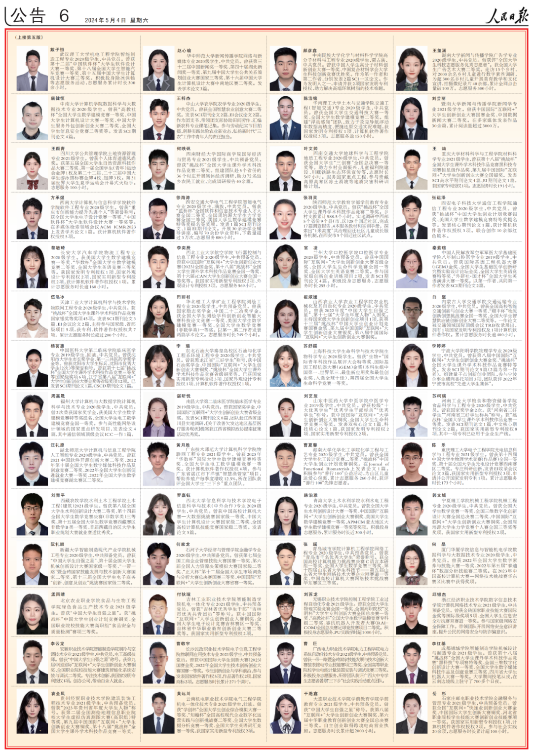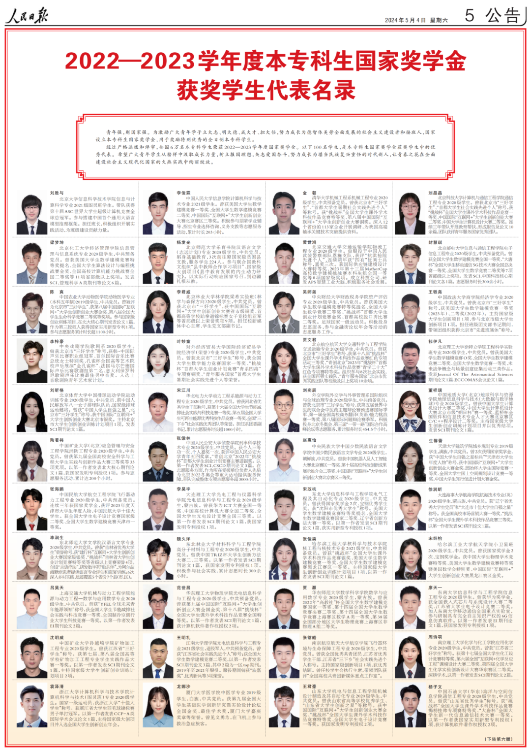 5月4日,《人民日报》专版刊登《2022—2023学年度本专科生国家奖学金获奖学生代表名录》,展示本专科生国家奖学金获奖学生中的100名优秀代表的风采。跟教育小微一起来认识一下他们吧↓↓↓