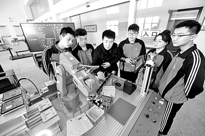 2023年3月28日,在河北省兴隆县职教中心,学生正进行工业机器人应用实训。 新华社发
