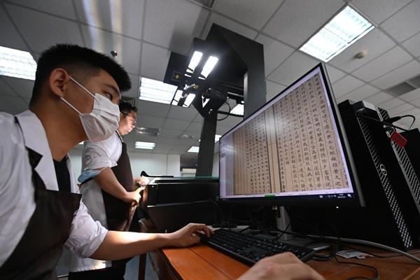 2023年5月,北京师范大学图书馆,工作人员正在将古籍进行数字化处理。视觉中国供图(资料图片)