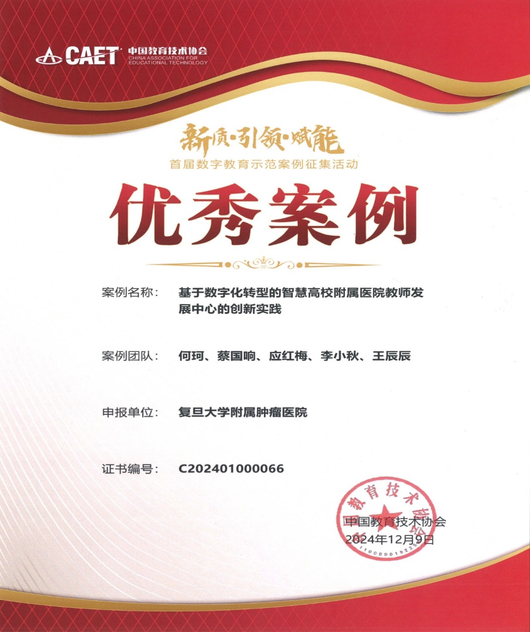近日,在中国教育技术协会主办、新华网承办的2024年“新质·引领·赋能”首届全国数字教育示范案例征集活动中,复旦大学附属肿瘤医院申报的《基于数字化转型的智慧高校附属医院教师发展中心的创新实践》入选优秀案例。