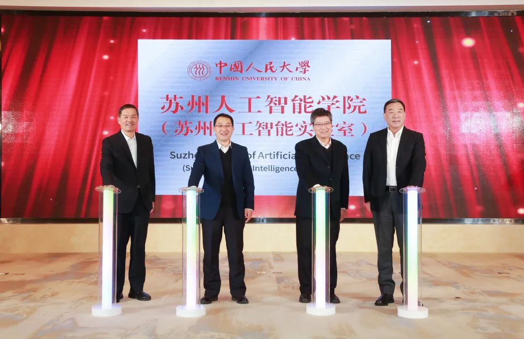 中国人民大学党委书记张东刚,中国人民大学校长林尚立,江苏省委常委、苏州市委书记刘小涛,苏州市委副书记、市长吴庆文共同为中国人民大学苏州人工智能学院、苏州人工智能实验室揭牌。