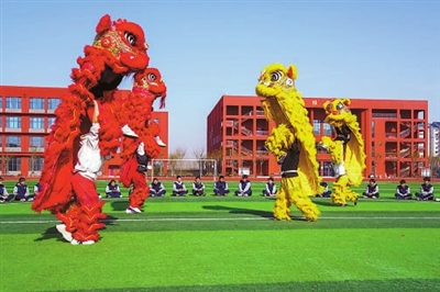 山东省淄博科技学校学生在进行迎开学舞狮演练。 张维堂 马东惠 摄