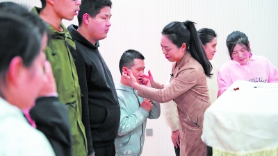 赵凤英启发中专音乐专业的学生感悟发声练习时身体部位的变化。商丘市特殊教育学校供图