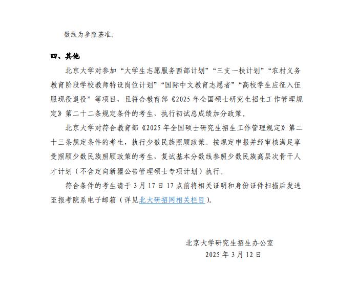 2、符合教育部《2025 年全国硕士研究生招生工作管理规定》第二十二条规定中“大学生志愿服务西部计划”“三支一扶计划”“农村义务教育阶段学校教师特设岗位计划”“国际中文教育志愿者”项目之一,服务期满且考核合格者,以及高校学生应征入伍退出现役等加分政策,执行初试总分加分照顾政策。