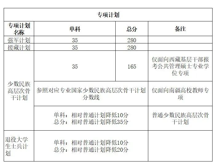 其中面向西藏地区“公共管理人才培养计划”专项,满分100分的单科成绩不低于40分、满分200分的单科成绩不低于90分、总分不低于160分;面向新疆喀什地区医学硕士专项,总分不低于235分,各单科成绩不作要求。