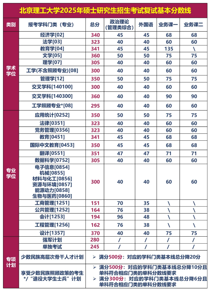 2.“退役大学生士兵计划”复试分数线为:在学校划定的复试基本分数线基础上,报考全日制的(考试科目满分为500分)单科降5分,总分降10分;报考非全日制的(考试科目满分为300分)单科降10分,总分降10分。