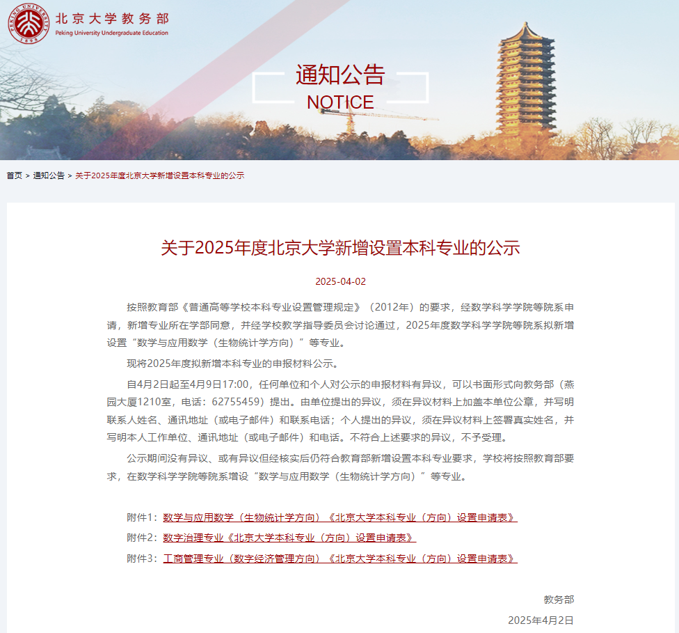 近日,北京大学教务处发布《关于2025年度北京大学新增设置本科专业的公示》。拟新增设置“数学与应用数学(生物统计学方向)”“数字治理”“工商管理专业(数字经济管理方向)”等3个专业。