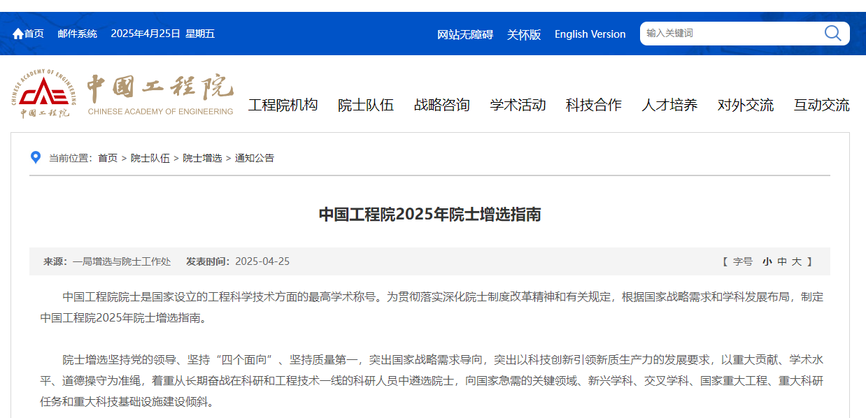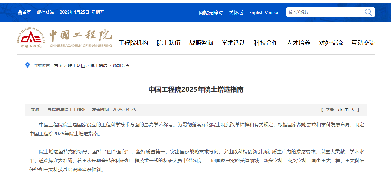 中国工程院院士是国家设立的工程科学技术方面的最高学术称号。为贯彻落实深化院士制度改革精神和有关规定,根据国家战略需求和学科发展布局,制定中国工程院2025年院士增选指南。