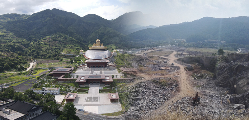 中国佛教五大名山之一雪窦山山脚下,有一个20年前炸山采矿留下的深坑(右),当地决定“种树”,建造弥勒圣坛。