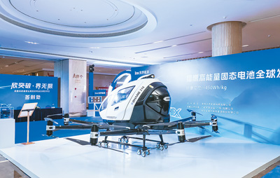 在飞行测试基地,搭载“猎鹰”锂金属固态电池的电动垂直起降飞行器(eVTOL)亿航EH216按照既定路线完成高功率起飞、巡航、悬停等动作后,缓缓降落在地面上。
