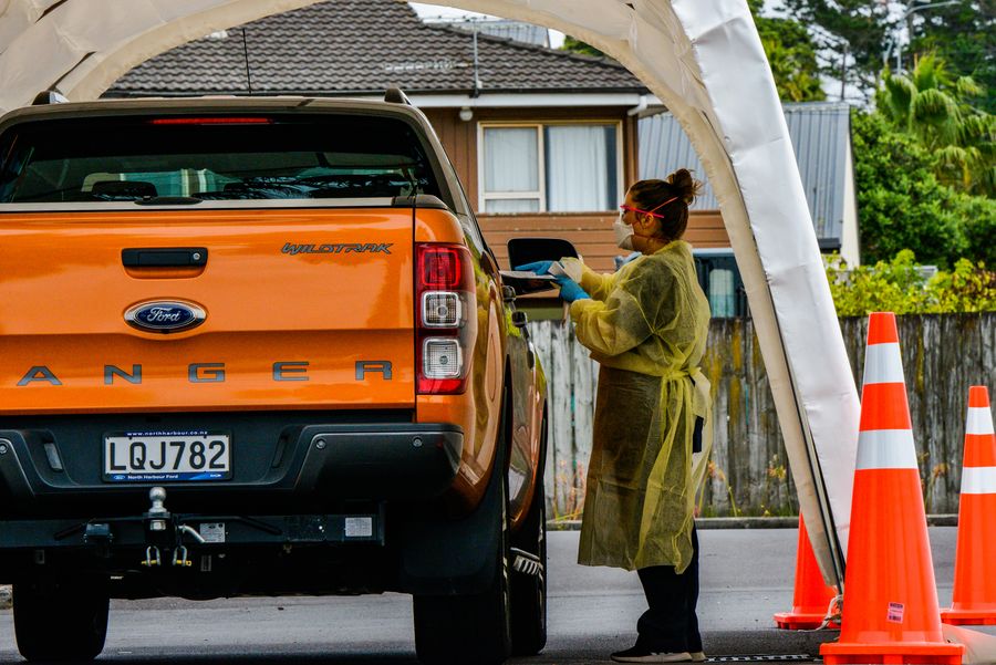 A medical worker conducts quick tests at a newly built mobile testing station in Auckland, New Zealand, March 23, 2020. (Photo by Li Qiaoqiao/Xinhua)