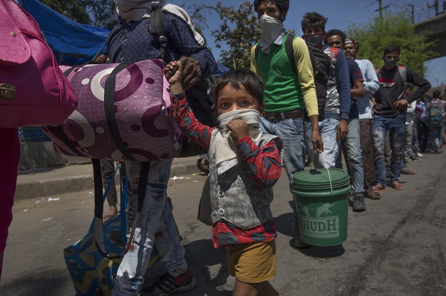 Migrant labourers in queues wait for buses at a bus station during the lockdown in New Delhi, India, March 29, 2020.(Xinhua/Javed Dar)