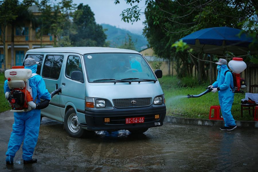 People disinfect a vehicle used to transport people home before it leaves a quarantine facility in Vietnam's northern province of Hoa Binh on March 18, 2020. (VNA/Handout via Xinhua) ■