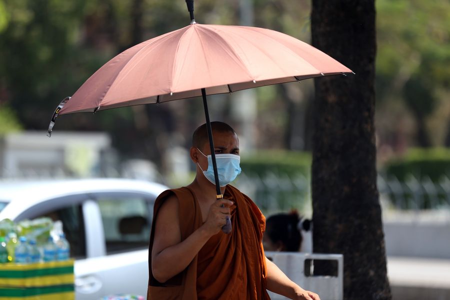 A monk wearing a mask walks on the street in downtown Yangon, Myanmar, March 29, 2020. (Xinhua/U Aung)