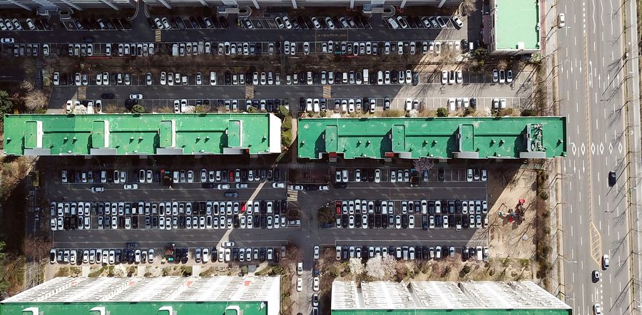 Aerial photo taken on March 29, 2020 shows a parking lot in Suwon, South Korea. (NEWSIS/Handout via Xinhua)