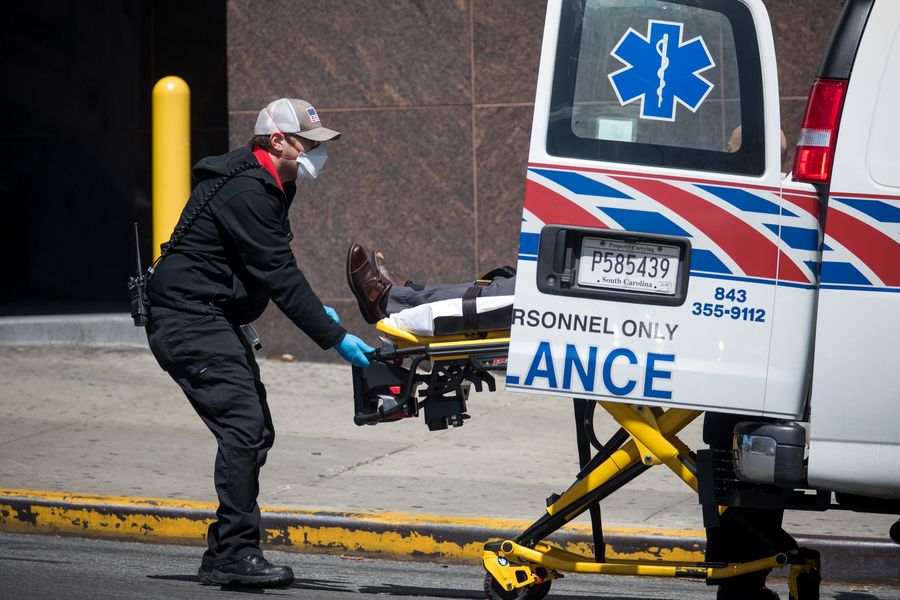 A healthcare worker wheels a patient out of an ambulance in front of BronxCare Hospital Center in the Bronx borough of New York, the United States, April 11, 2020. (Photo by Michael Nagle/Xinhua)