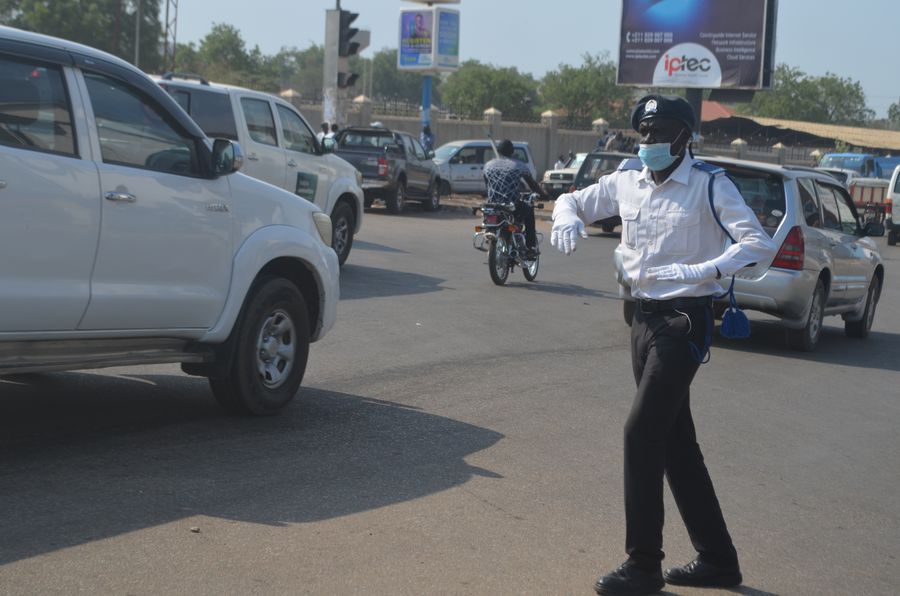 A traffic police officer wearing a face mask controls traffic at a roundabout in Juba, capital of South Sudan, April 8, 2020. (Xinhua/Denis Elamu)