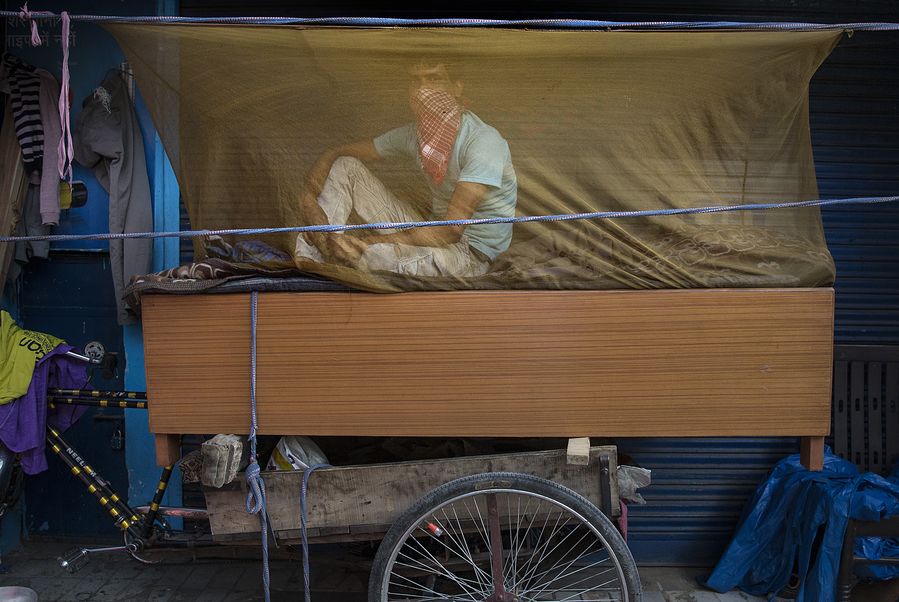 A man sits inside a mosquito net at his temporary shelter set up on a rickshaw during the lockdown due to COVID-19, in New Delhi, India, April 17, 2020. (Xinhua/Javed Dar)