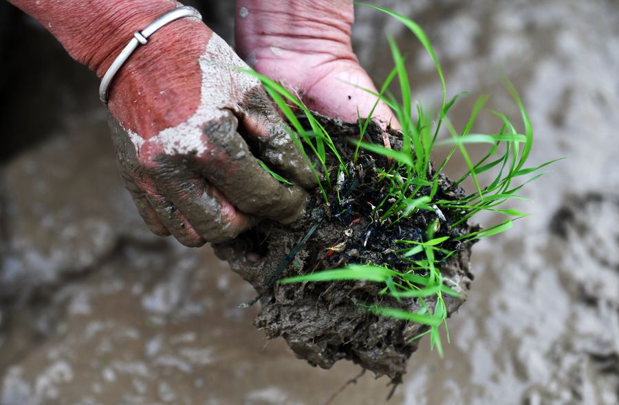 A farmer plants rice seedlings in a terraced field at Jiache Village of Jiabang Township in Congjiang County, southwest China's Guizhou Province, April 18, 2020. (Xinhua/Yang Wenbin)