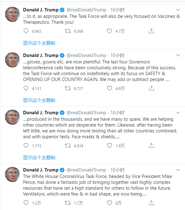 A screenshot of U.S. President Donald Trump's tweets about the upcoming change of the White House Coronavirus Task Force. (Xinhua)