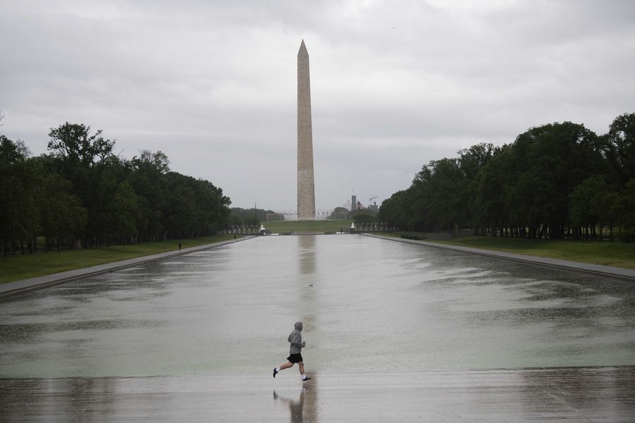 A man jogs in rain near the Washington Monument in Washington D.C., the United States, May 6, 2020. (Xinhua/Liu Jie)