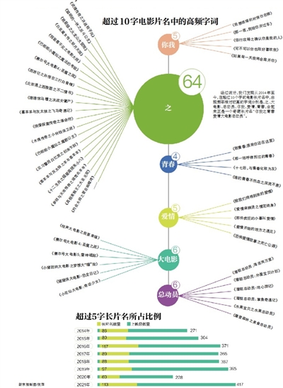 动画片也是长片名的高度使用者,不少动画片是系列电影,比如《大头儿子和小头爸爸》和《喜羊羊与灰太狼》系列,几乎都是当年片名字数最多的电影,就因为主标题本身就很长。据调查,超过10字长片名中最常出现的字词是之、你我、爱情、青春、总动员等。有些电影喜欢找一些诗词、格言、歌曲名、歇后语做改编,或是基于小说名字、剧本台词进行提取,这样的电影也容易成为长片名。李玉霖认为,除了IP加持的电影,部分长片名电影存在一些传播上的不利,“制作者在创作的时候不要太故弄玄虚,朗朗上口且直指电影内容的片名一定是观众喜闻乐见的。”(记者 周慧晓婉)